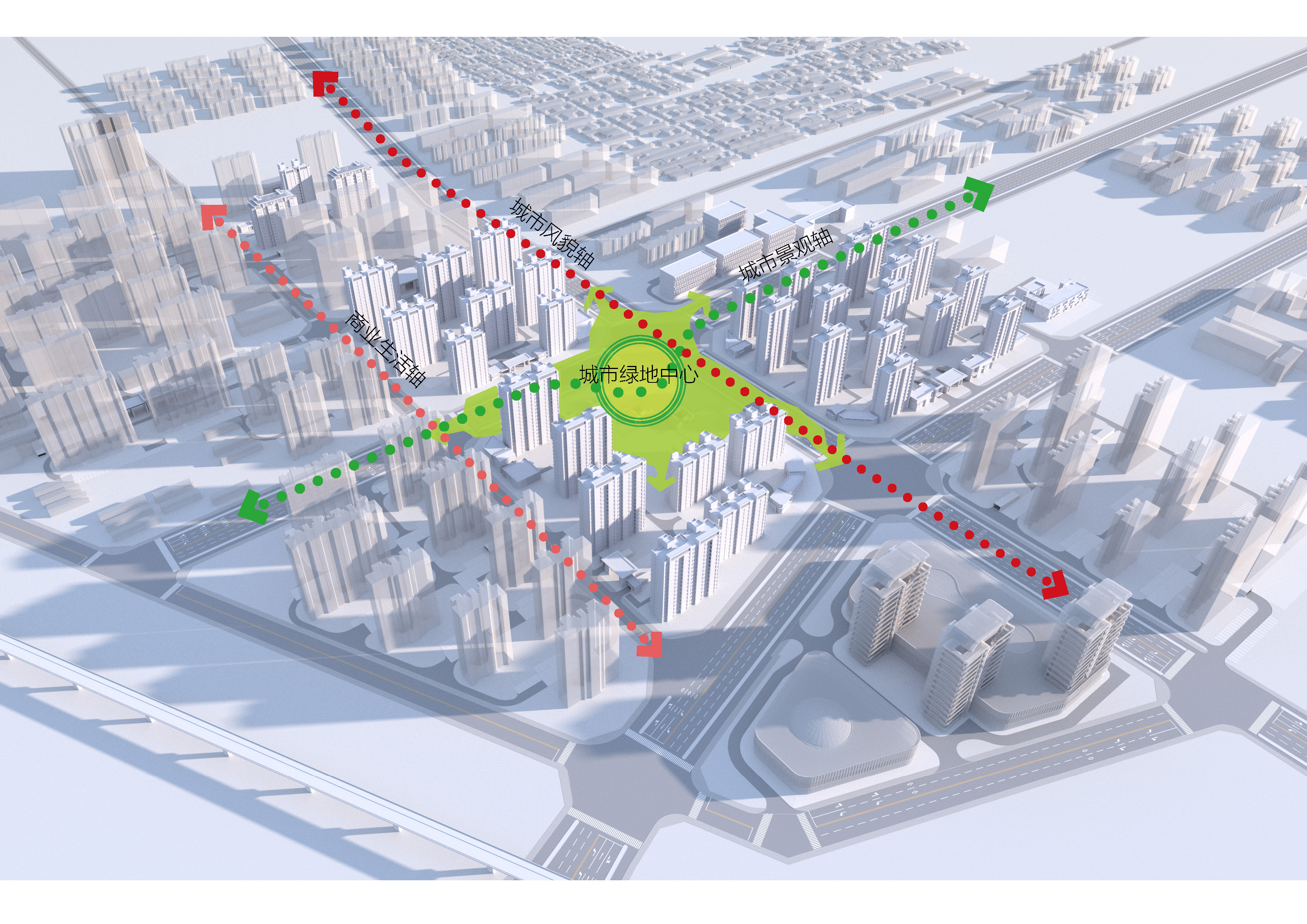 項目規(guī)劃設(shè)計理念為“一心兩軸”。其中,“一心”是結(jié)合區(qū)域文脈,打造以梁氏宅院所在城市綠地為中心的組團社區(qū);“兩軸”一是沿城市主路營造建筑錯落有致的城市風(fēng)貌軸、二是沿張營大街打造城市景觀軸。通過“一心兩軸”的打造,優(yōu)化城市風(fēng)貌建筑空間形象,構(gòu)筑宜人的開放空間,創(chuàng)建完善的綠色交通系統(tǒng)以及布局完備的配套服務(wù)設(shè)施。