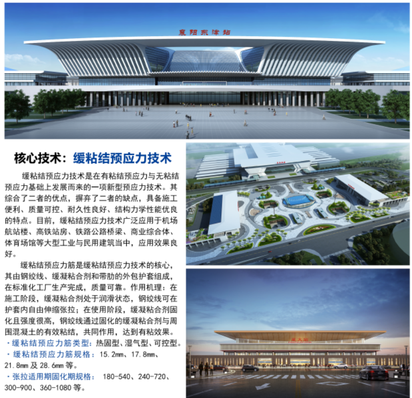 在我國鐵路、航空、公路等交通行業(yè)事業(yè)蓬勃發(fā)展的進程中,中技集團作出了積極貢獻,一是積極參與40余座高鐵客站建設(shè),如北京豐臺南站、北京朝陽站、北京副中心站、北京大興站,“一帶一路”中緬鐵路緬甸萬象站,川藏鐵路澤當(dāng)站、林芝站,中國第四代鐵路客站杭州西站、廣州白云站等,樹立了“中技預(yù)應(yīng)力”優(yōu)質(zhì)品牌。二是高度重視預(yù)應(yīng)力技術(shù)標準的升級,先后編制發(fā)布或在編多部預(yù)應(yīng)力相關(guān)標準,如《大直徑緩粘結(jié)預(yù)應(yīng)力鋼絞線》、《濕氣型緩粘結(jié)預(yù)應(yīng)力鋼絞線》、《濕氣型緩粘結(jié)預(yù)應(yīng)力鋼絞線專用粘合劑》、《公路橋梁緩粘結(jié)預(yù)應(yīng)力混凝土結(jié)構(gòu)技術(shù)指南》、《緩粘結(jié)預(yù)應(yīng)力錨桿錨樁技術(shù)規(guī)程》、《超高強預(yù)應(yīng)力鋼絞線》等。三是高效推進預(yù)應(yīng)力科研成果轉(zhuǎn)化,創(chuàng)造了多個“國內(nèi)首個”,先后實施了國內(nèi)首個大直徑緩粘結(jié)預(yù)應(yīng)力技術(shù)應(yīng)用項目(高鐵安順西站站前廣場,2016年),國內(nèi)首個濕氣型緩粘結(jié)預(yù)應(yīng)力技術(shù)應(yīng)用項目(阜陽西站站前廣場,2018年),國內(nèi)首個緩粘結(jié)預(yù)應(yīng)力錨桿技術(shù)應(yīng)用項目(南海體育中心,2020年),國內(nèi)首個緩粘結(jié)預(yù)應(yīng)力抗浮樁技術(shù)應(yīng)用項目(化龍安置區(qū)工程,2020年),國內(nèi)首個超高強預(yù)應(yīng)力技術(shù)應(yīng)用項目(廈門新體育中心,2021年)。