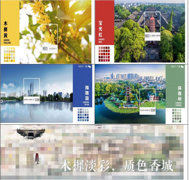 項目團隊運用色彩學(xué)的調(diào)研分析方法,通過溯文脈、理現(xiàn)狀、推主色、定旋律、落應(yīng)用對新都進行梳理,通過尋找能夠體現(xiàn)新都區(qū)歷史文化傳統(tǒng)和自然色彩基因的城市色彩特征,尋找匹配新都區(qū)光環(huán)境、自然環(huán)境、人文環(huán)境及傳統(tǒng)建筑的城市色彩特征,最終選定以成都天府黃色系為延續(xù),來源于新都明朝狀元楊升庵“寶書林中碧玉涼·秋風(fēng)又送木樨黃”詩句中的“木樨黃”作為新都區(qū)城市色彩特征色主色,以新都歷史建筑的“寶光紅”,新都城市發(fā)展的“新都藍”,桂湖森林基底的“荷香綠”為特征色色系,并根據(jù)新都的人文歷史、地理特征、城市發(fā)展確定城市色彩基調(diào)“木樨淡彩,質(zhì)色香城”。