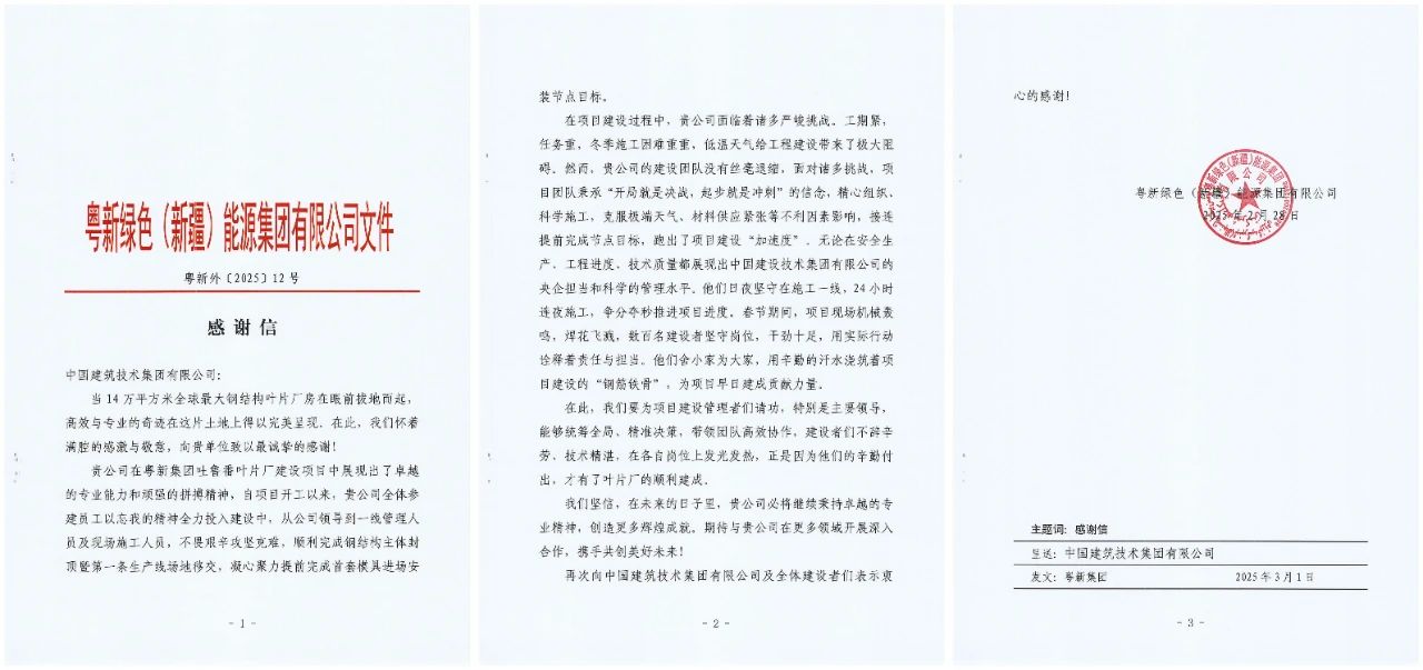 近日,中國(guó)建技收到明陽(yáng)智慧能源粵新綠色(新疆)能源集團(tuán)有限公司發(fā)來(lái)的感謝信。對(duì)中國(guó)建技在14萬(wàn)平米的全球最大鋼結(jié)構(gòu)葉片廠房——吐魯番葉片廠房項(xiàng)目建設(shè)過(guò)程中的優(yōu)異表現(xiàn),給予了充分肯定和真摯感謝。
