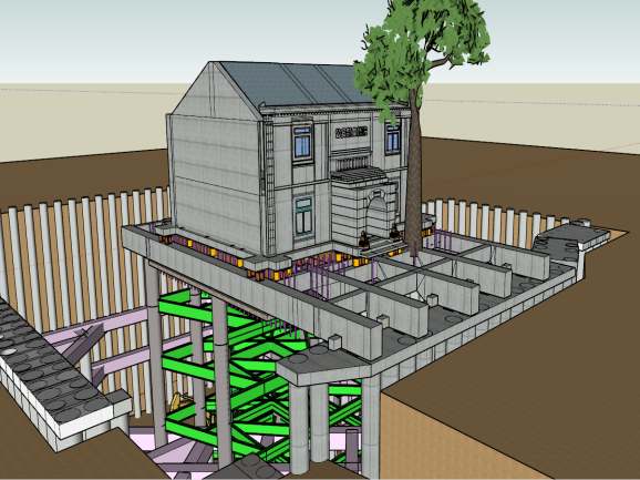 該建筑原為公安部辦公樓,始建于民國時(shí)期,是西城區(qū)重點(diǎn)保護(hù)文物。建筑占地面積約400平方米,東西長約15米,南北長約14米,地上兩層,地下基坑深度達(dá)20米。在該地塊開發(fā)過程中,需在建筑周邊及下方進(jìn)行基坑開挖,同時(shí)西側(cè)地鐵19號線太平橋站B口的施工也在同步進(jìn)行。為確保歷史建筑的安全,項(xiàng)目團(tuán)隊(duì)對其進(jìn)行了原址托換處理。