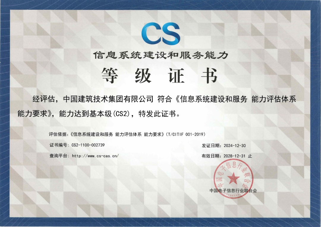 近日,中國建技成功通過中國電子信息行業(yè)聯合會評審,榮獲CS2信息系統(tǒng)建設和服務能力認證。這是中國建技繼質量、環(huán)境、職業(yè)健康安全、信息技術服務、信息安全管理體系認證后,獲得的又一項國家級權威認證。