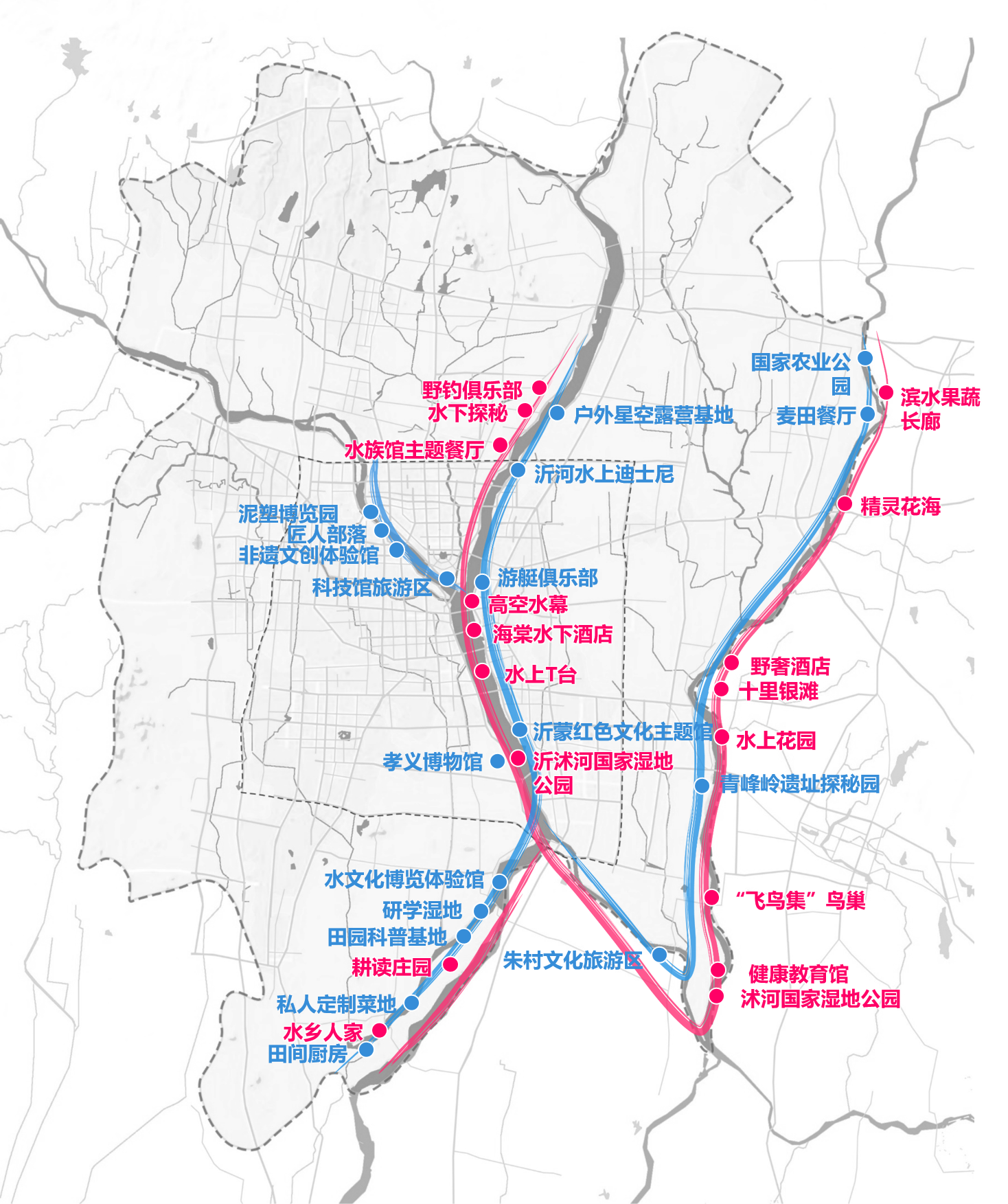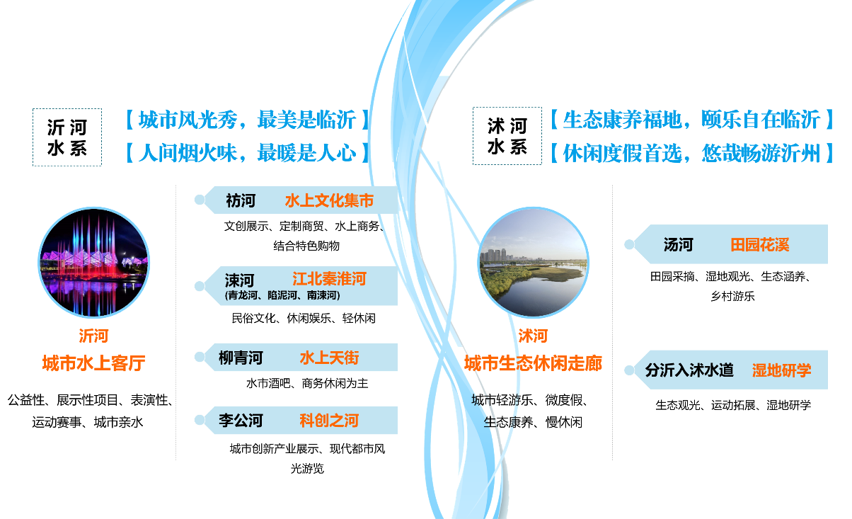 2.“水+旅游”專題——從“河流振興、因水而親、城鄉(xiāng)共榮”的角度出發(fā),通過對(duì)主要水系河流進(jìn)行發(fā)展定位,完善河流旅游產(chǎn)品和項(xiàng)目業(yè)態(tài),以主題游線設(shè)計(jì)、沂水夜游、其他特色項(xiàng)目等為吸引點(diǎn),優(yōu)化提升臨沂市水上旅游品質(zhì),樹立臨沂北方水城的品牌形象與市場(chǎng)競爭力。