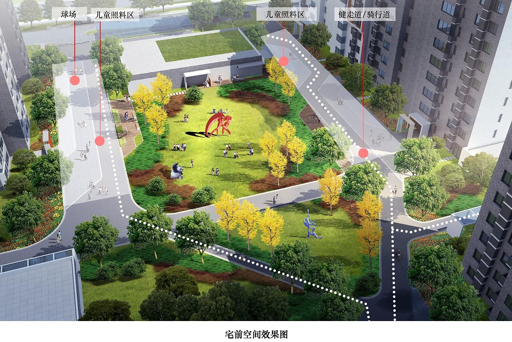 利用宅前消防登高場(chǎng)地規(guī)劃打球、健走、騎行和兒童照料等內(nèi)容,將宅前空間作為單元住戶的交往活力場(chǎng)所?;顒?dòng)場(chǎng)地外擴(kuò),結(jié)合綠化布置休閑座椅、花池廊架和文化藝術(shù)裝置,合理布局自行車棚、信報(bào)箱、垃圾收集箱和配電室等項(xiàng)設(shè)施。單元樓門(mén)設(shè)置入口標(biāo)識(shí)和門(mén)禁,居民活動(dòng)也能對(duì)樓宇安全發(fā)揮良好的監(jiān)控作用。