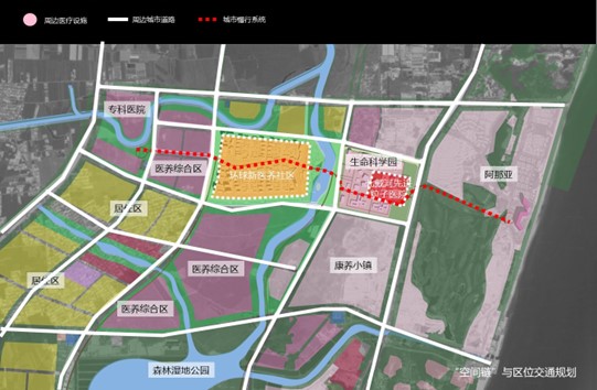 本項規(guī)劃以產(chǎn)業(yè)功能布局的需求為基礎,試圖通過“空間鏈”的規(guī)劃方法,將本規(guī)劃區(qū)納入核心區(qū)大醫(yī)養(yǎng)功能區(qū)中,形成開放的城市空間系統(tǒng),通過交通、景觀及區(qū)劃融合的方式,促進本醫(yī)養(yǎng)社區(qū)與生命科學園、周邊醫(yī)養(yǎng)綜合區(qū)、濱海度假區(qū)之間的空間聯(lián)系和產(chǎn)業(yè)互動。