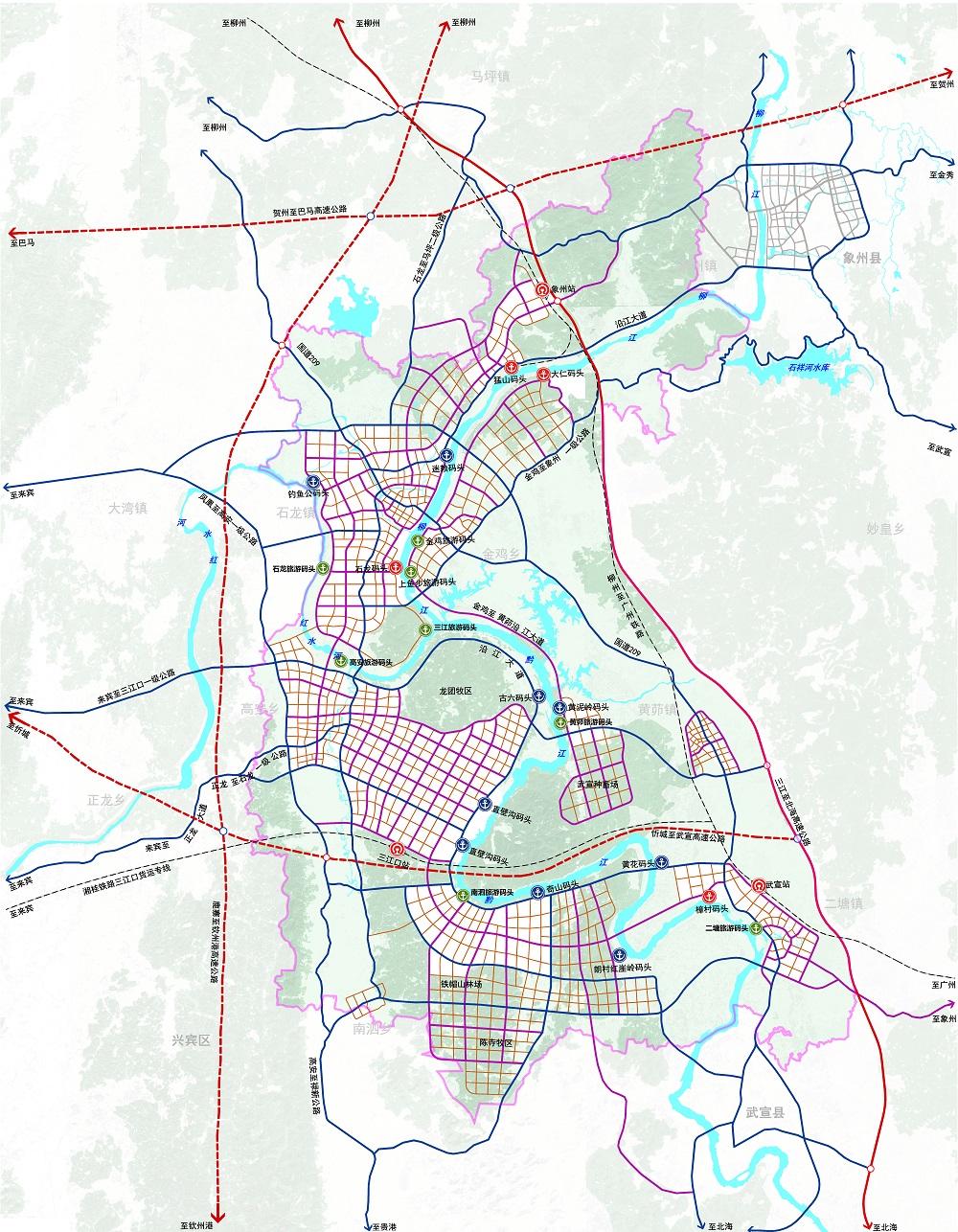 高效綜合交通系統(tǒng)規(guī)劃——以區(qū)域性交通互聯(lián)互通為突破點(diǎn),形成以港口、鐵路、公路為核心的多式聯(lián)運(yùn)對外綜合交通體系,強(qiáng)化以港口碼頭為中心建設(shè)通往柳州、河池等周邊城市以及通往粵港澳大灣區(qū)城市的黃金水道;重點(diǎn)推進(jìn)三江口新區(qū)產(chǎn)業(yè)組團(tuán)與國道209、國道355等區(qū)域性交通干道的銜接;完善以港區(qū)港口為支點(diǎn)的港產(chǎn)城融合發(fā)展體系:加快石龍碼頭、直壁溝碼頭、黃泥嶺碼頭及其配套設(shè)施的建設(shè),以港口為依托,完善集疏運(yùn)體系,促進(jìn)港口與腹地經(jīng)濟(jì)良性循環(huán)發(fā)展,驅(qū)動新區(qū)從“碼頭經(jīng)濟(jì)”走向港產(chǎn)城融合發(fā)展。