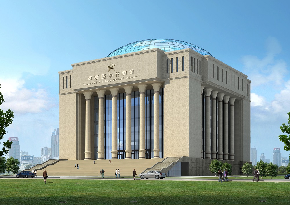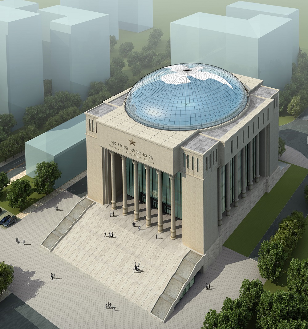 中國人民解放軍軍事醫(yī)學(xué)博物館位于北京市海淀區(qū)太平路,軍事醫(yī)學(xué)研究院內(nèi)西南角,是一座國家級大型軍事醫(yī)學(xué)類博物館。建筑用地0.873公頃,總建筑面積38000平方米。主體建筑方正,頂部圓形玻璃穹頂直徑47米,表達了天圓地方的中國文化理念。穹頂玻璃幕結(jié)合太陽能技術(shù),部分太陽能反射板組成和平鴿圖案,寓意世界和平,表達了設(shè)計的主題。